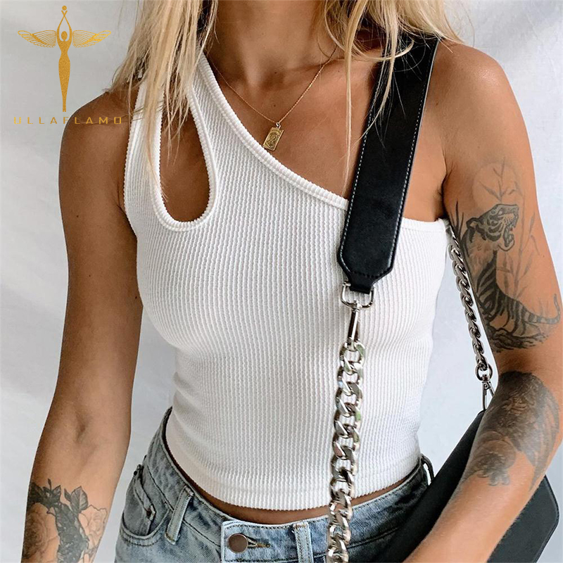 Sexy Solid One-Shoulder Women's Tank Tops Knitted Ribbed Hollow Backless Female Tops Temperament Casual Sleeveless Slim Top Vest