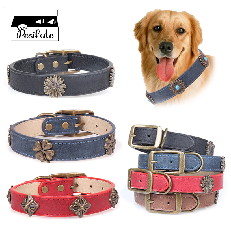 Leather Pet Collars for Medium or Large Dogs Adjustment Range 12 to 18-Inch Black Red Blue Brown Four Color Pet Collars